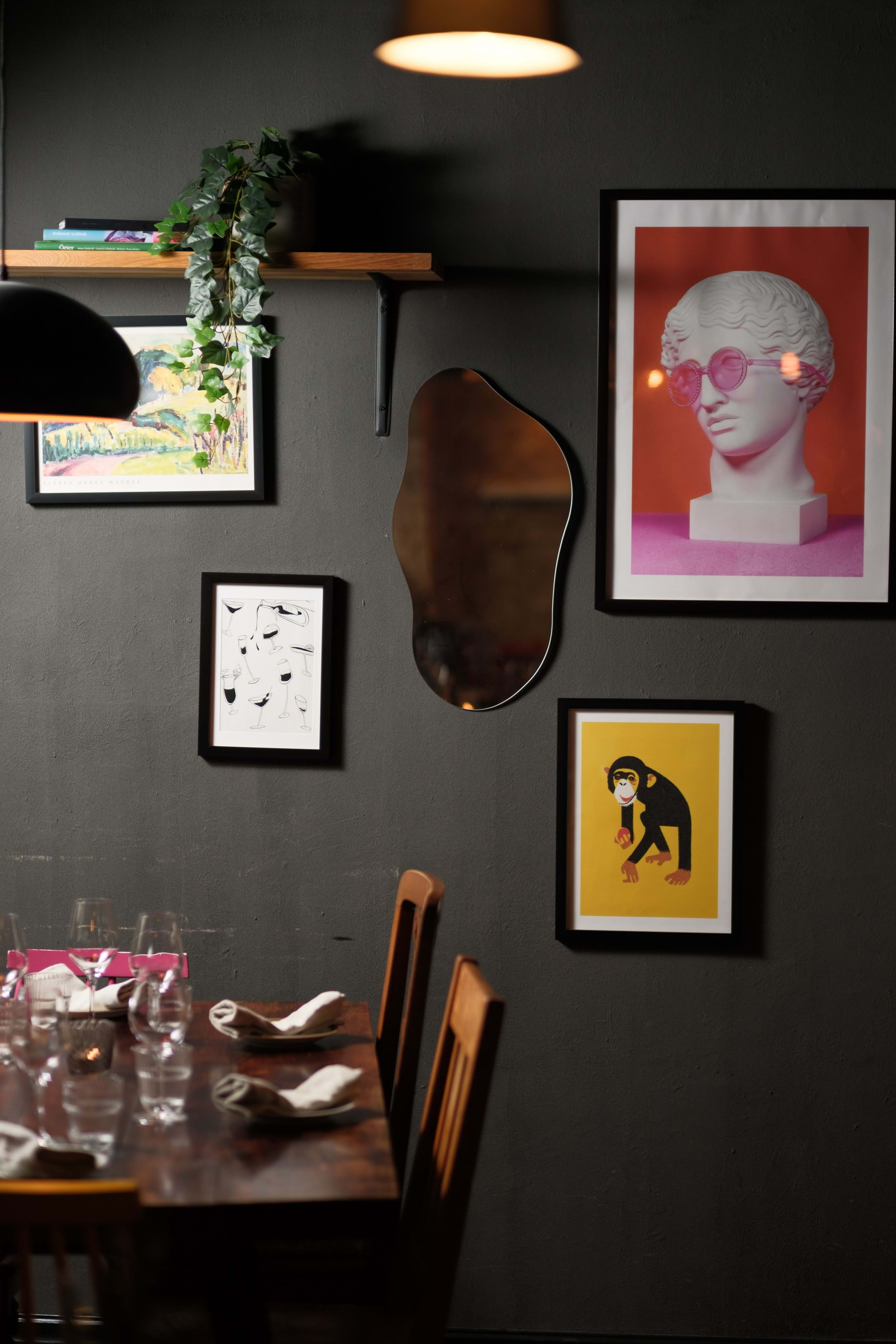 Lokalen får en mysig och unik prägel av grovhuggna tegelväggar, mörka färger och lite omaka möbler. Ofta råder en lagom stimmig känsla à kvarterskrog, med sorl mellan borden och uppsluppen stämning. På sommaren kan man även hänga i solen på sittplatserna utanför entrén.