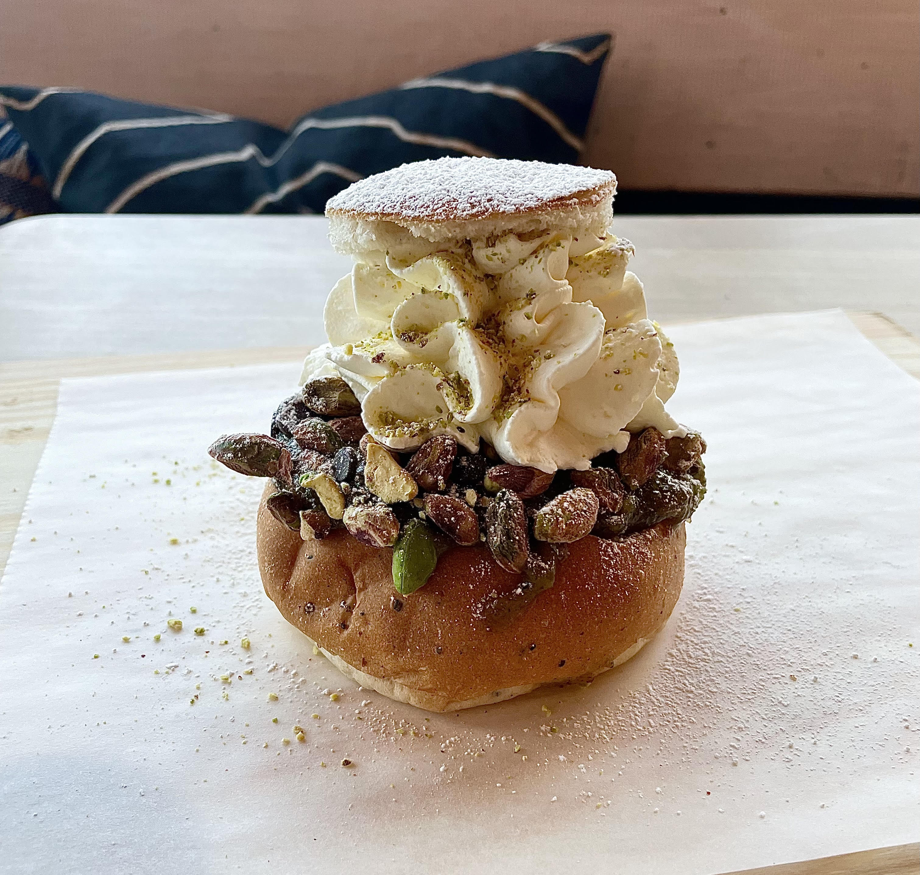Sedan Bröd & Salt lanserade pistagesemlan för ett par år sedan har flera caféer och bagerier hakat på trenden och serverat semlor där mandelmassan fått ge utrymme åt pistagemassa. Att denna variant blivit så populär beror sannolikt till stor del på att den egentligen är ganska klassisk, bara med en liten (och naggande god) twist. Pistagesemlor hittar du än idag på Bröd & Salts olika filialer, och även Eataly har en variant som dessutom innehåller pistagekräm.