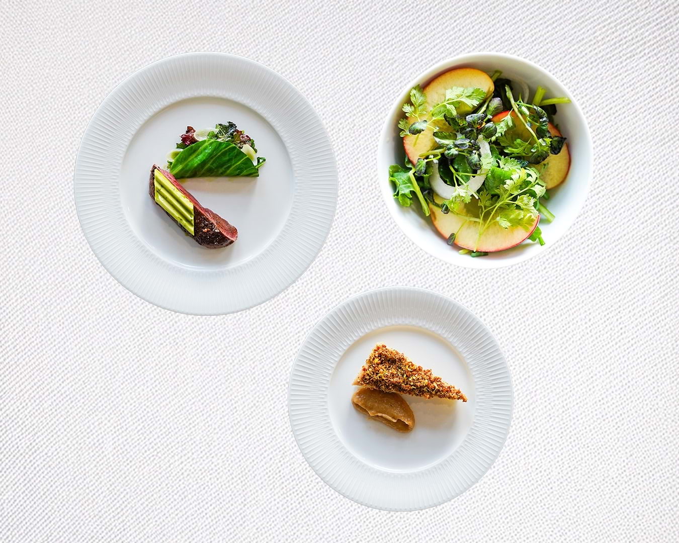 Kryddstekt renrostbiff, kål, ramslök och steksky. Serveras med klimp med variation på jordärtskocka, smaksatt med miso på bondböna och sallad på äpple och kål.