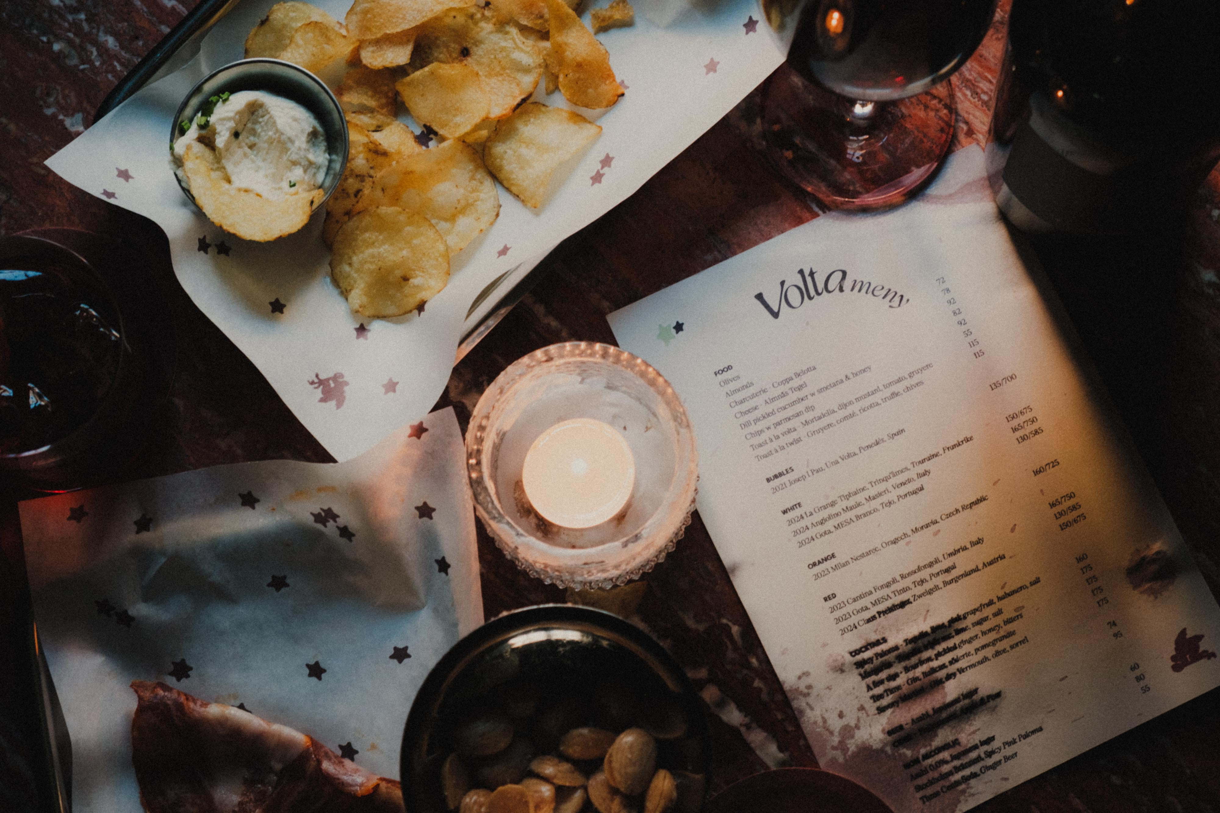 Kvällarna inleds ofta i lite lugnare tempo, då man kan komma hit för att ta ett glas, umgås och kanske spela kort eller backgammon. Utöver cocktails och ett brett utbud av naturvin finns ost, chark och andra smårätter på menyn. Allt efter vad kvällen lider ökar pulsen och Volta tar skepnad av en nattklubb med gästande dj:s som styr musiken. Mer ofta än sällan anordnas annat kul såsom quiz, temakvällar, livejazz och konstvernissage.